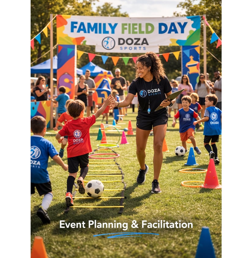 Doza Sports specializes in creating memorable sports-centered events that bring families and communities together through active play. From Family Field Days and school activity festivals to community sports celebrations, we design and facilitate experiences that are both structured and exciting for participants of all ages.